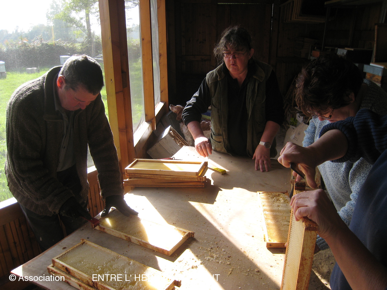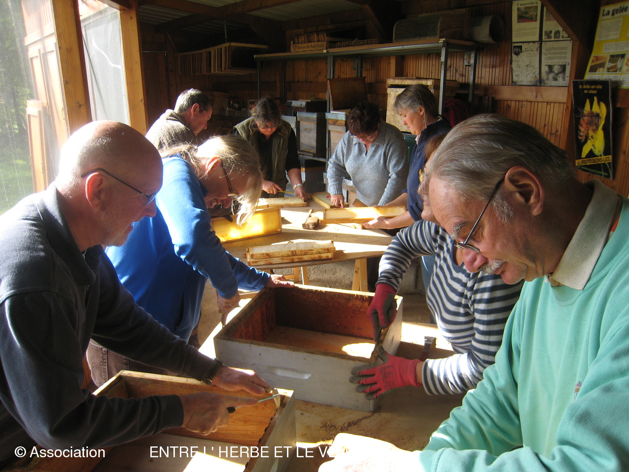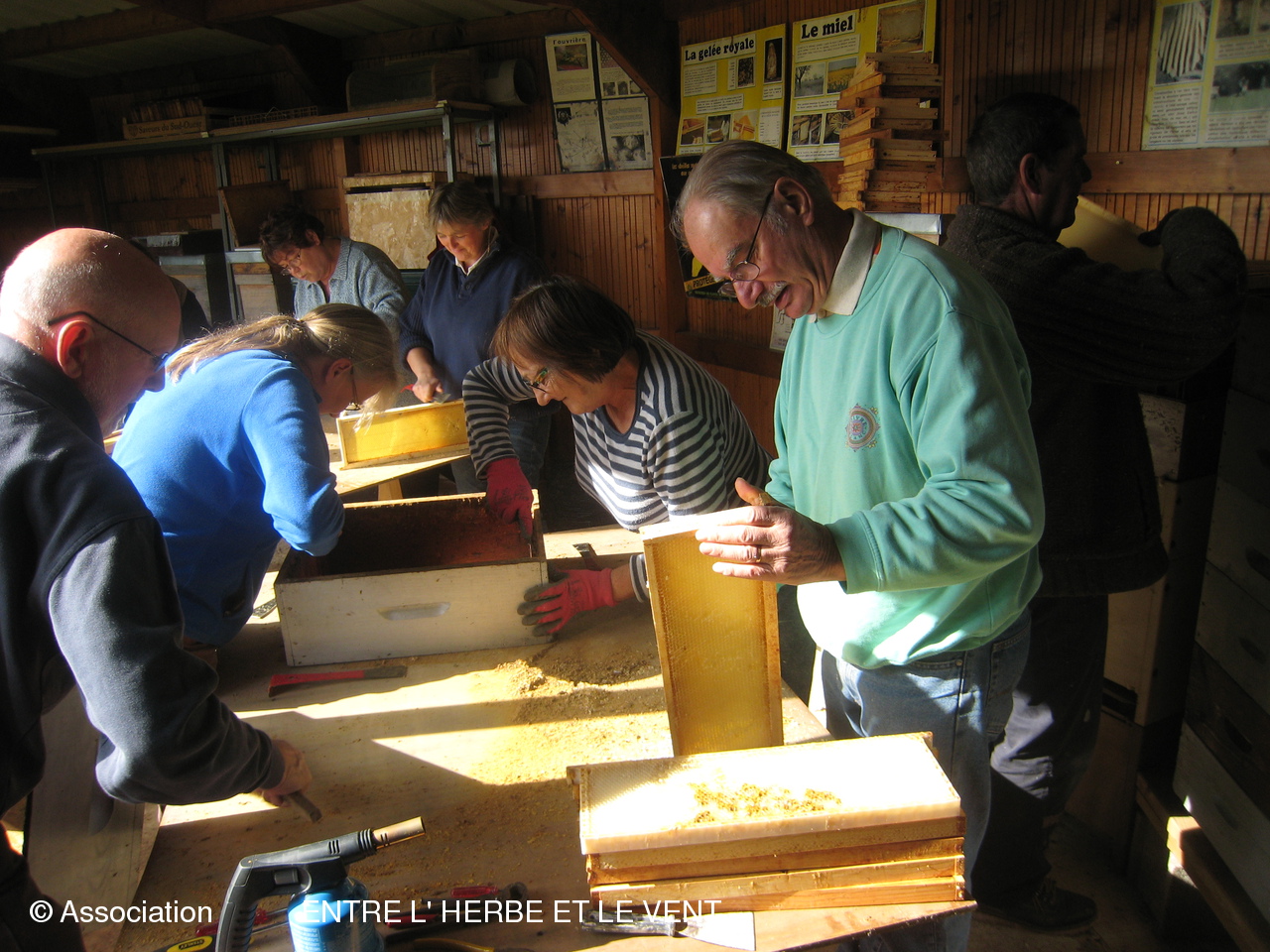 L'ambiance était joyeuse samedi après-midi à la Maison de l'abeille où les adhérents étaient conviés à un cours pratique de nettoyage des hausses et remisage du matériel pour l'hiver. Tout en s'activant pour gratter les traces de cire et de propolis, les participants ont échangé leurs astuces et savoir-faire. Tout au long de l'après-midi, Yves Dautriat a donné de précieux conseils. Gervais Lamare avait apporté son trépied et une lessiveuse pour faire la démonstration de rénovation des cadres à la lessive de soude. Et, comme d'habitude, la convivialité était au rendez-vous et la séance s'est terminée par une collation à la maison des associations. Merci à Sylvie pour ce fameux gâteau aux pommes et à Marie pour ce pot amical bienvenu!